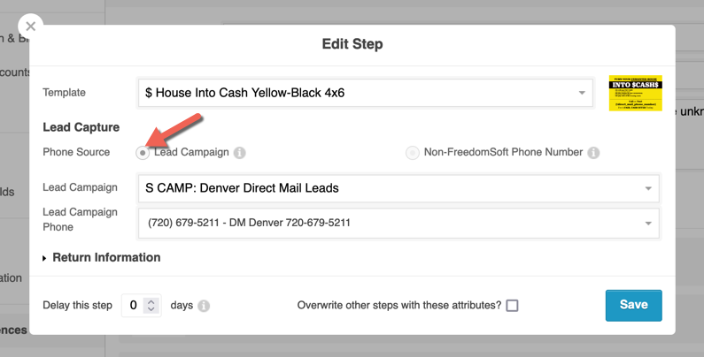 Note: When you have a FreedomSoft phone number linked to a campaign, it will automatically display in the Lead Campaign Phone field for that sequence step.